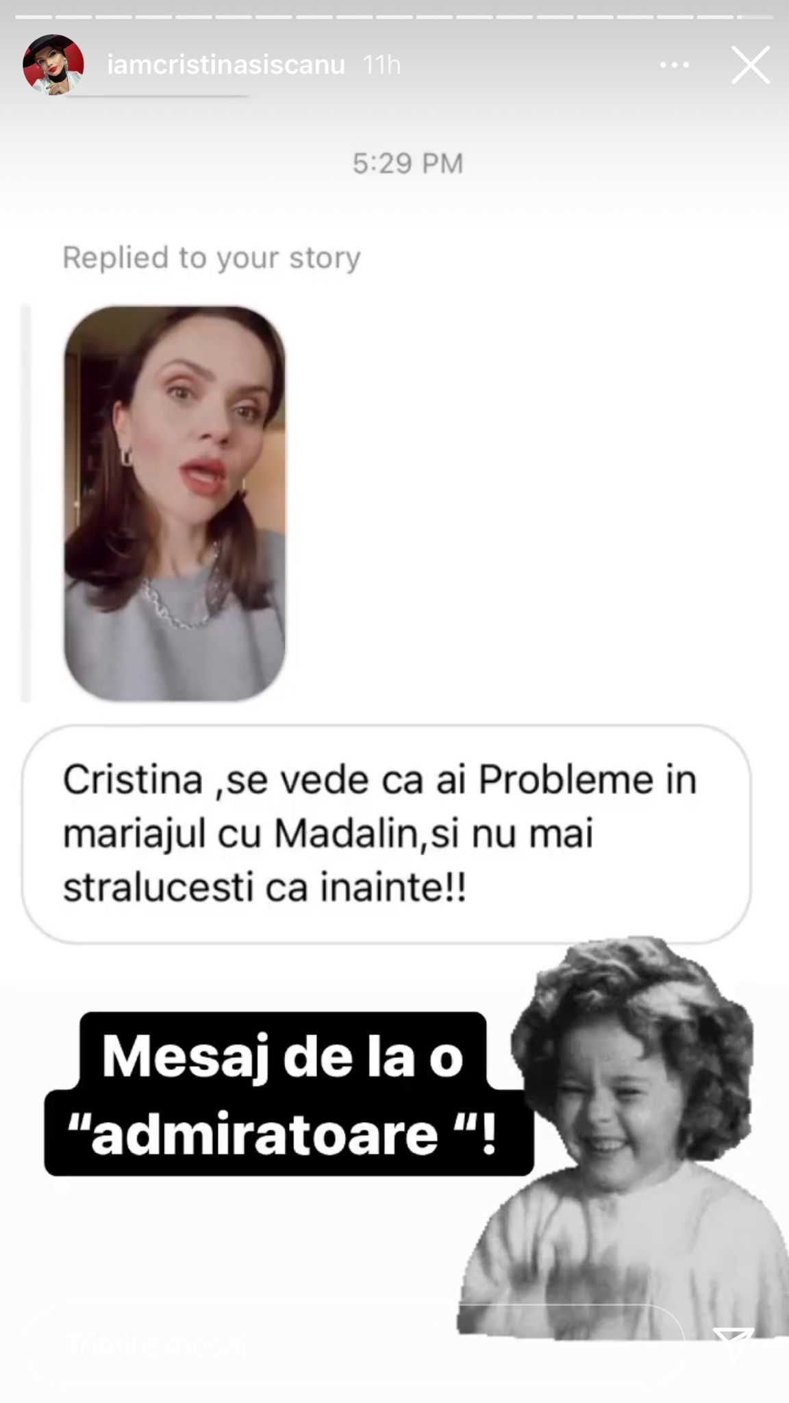 „Pentru cei care urmează să devină părinți… să știți ce vă așteaptă!??? Aici Petra avea doi ani și vorbea moldovenește. Îi ceream voie să dorm cu tati, reacția ei este fabuloasă ???”, a scris Cristina Șișcanu.