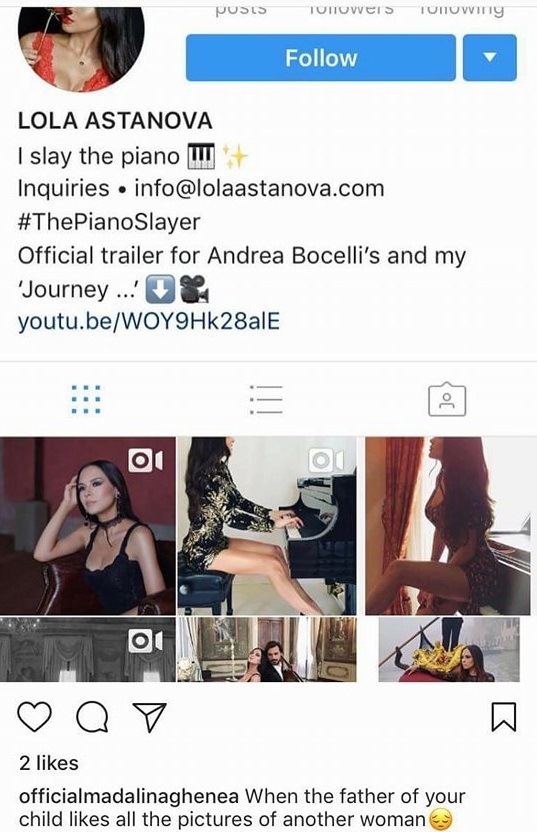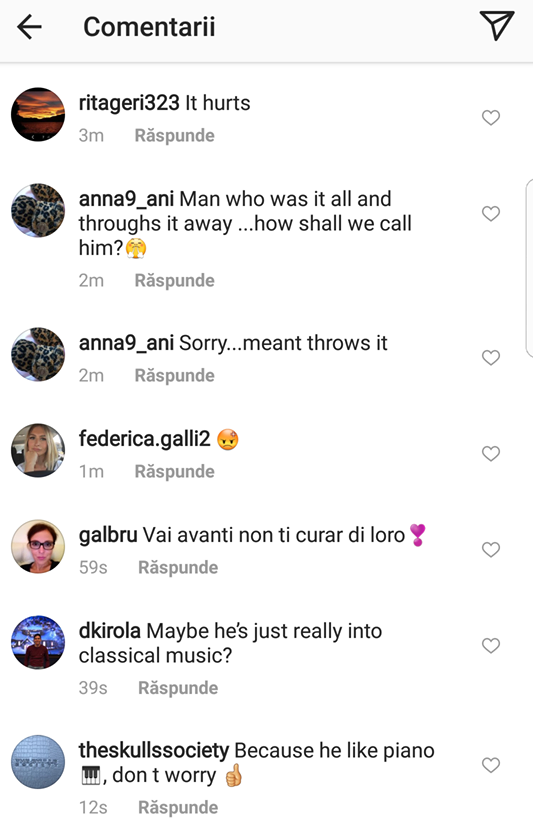 ”Când tatăl copilului tău apreciază toate imaginile unei alte femei”, a scris ea în dreptul imaginii în care apărea contul respectivei tinere. Evident, comentariile n-au ezitat să apară: ”Doare”, ”Îmi pare rău, ştiu ce înseamnă”, ”Poate că doar apreciază muzica clasică?”, ”Îi place pianul, nu te supăra.”, au fost câteva dintre mesajele lăsate de fani.