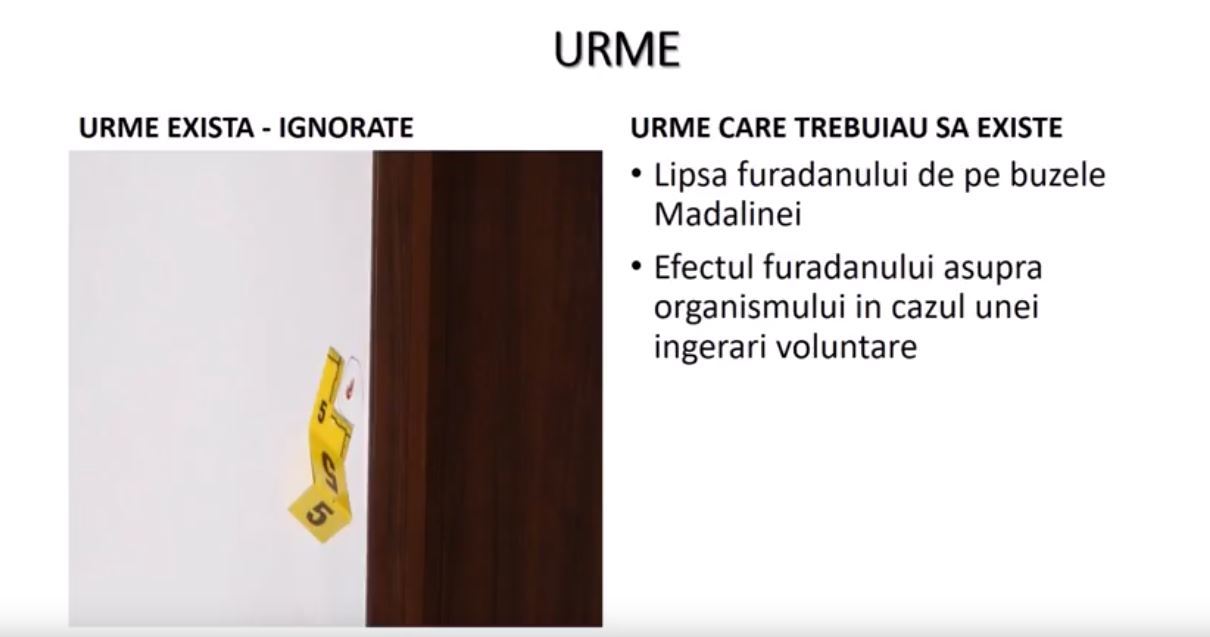 „Unul din modelele medicinei legale si toxicologiei care arata ca nu a fost suicid: cercetarile, stiinta arata ca Furadanul care este luat de orice specie, indiferent daca este pasare, animal sau om, are ca efect miosis. Sunt pupilele constranse, dupa cum vedeti sunt cat gamalia de ac.