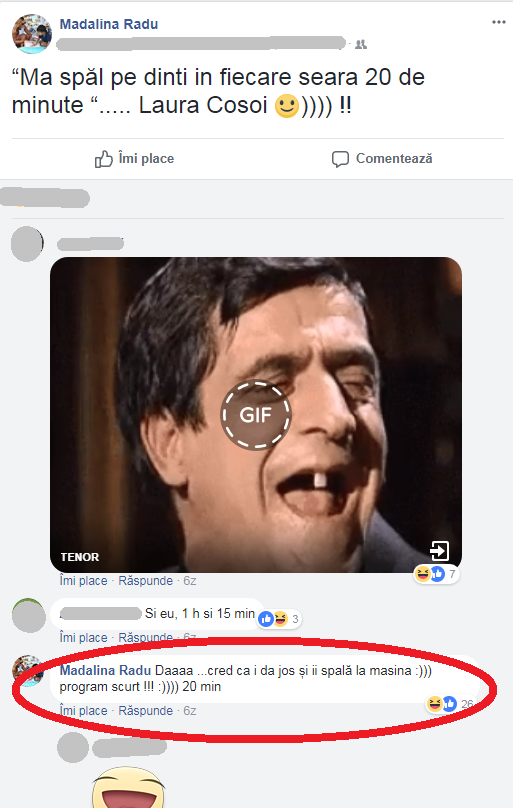 Probabil Madalina Radu radea de ideea in sine ca Laura Cosoi are timp sa se spele 20 de minute pe dinti, ori ea, de cand a devenit mamica isi calculeaza fiecare minut in asa fel incat sa ai timp pentru copilul ei, iar spalatul danturii ii ia probabil un minut. Cert este ca la postarea facuta de fosta prezentatoare tv Madalina Radu, in care face misto de declaratiile Laurei Cosoi, s-a creat nu numai o nebunie, ci si o mare distractie pentru ca unii dintre fani au adaugat nu doar comentarii, ci si imagini haioase cu personaje fara dinti sau doar stirbe.