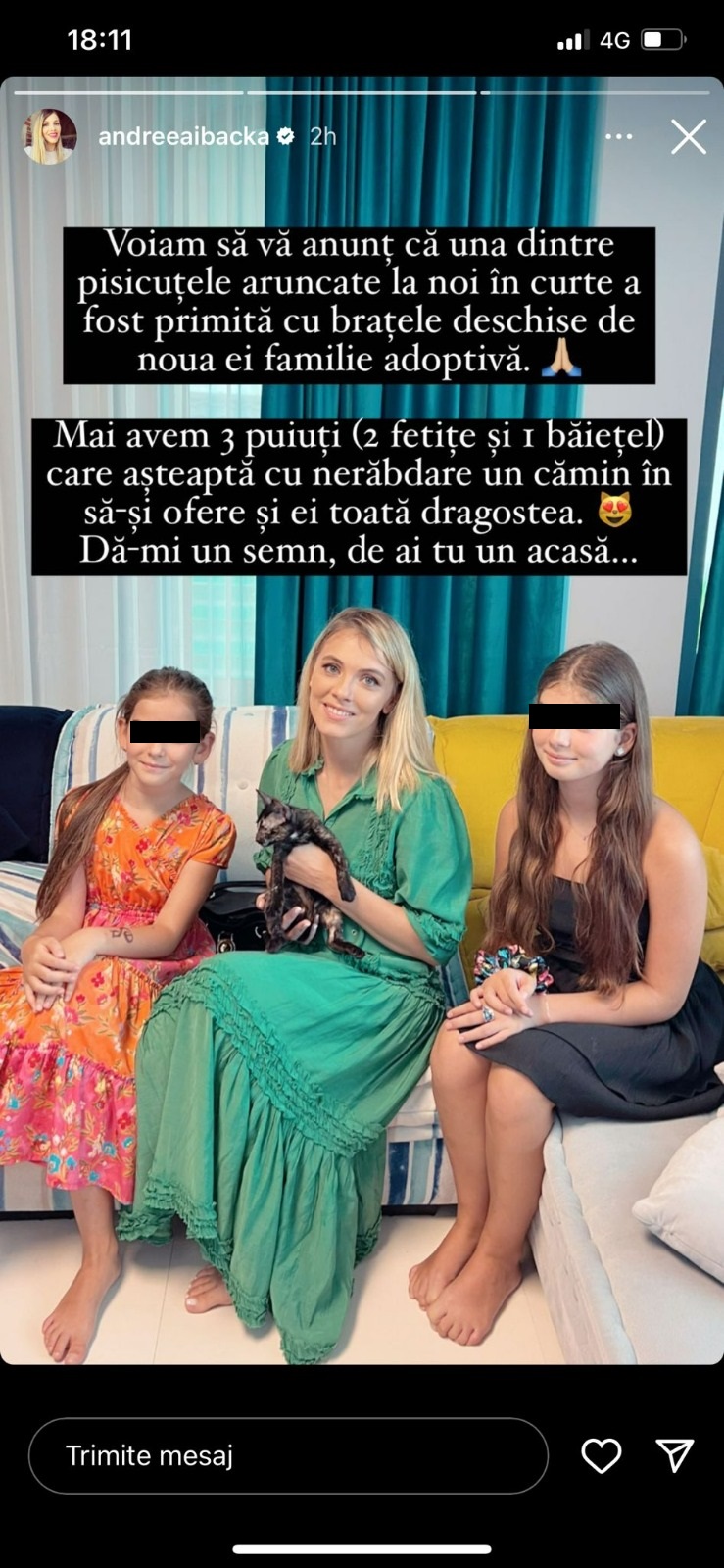 Andreea Ibacka a anunțat pe Instagram că are trei puiuți de pisică care își caută stăpân.