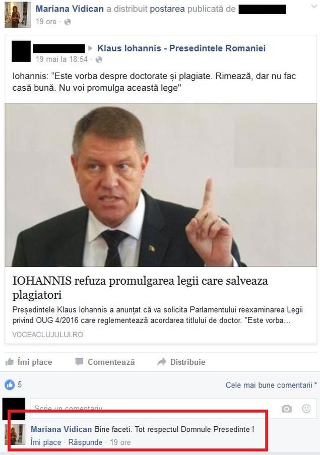 Divortul inevitabil al Alinei Vidican pare s-o fi facut pe mama acestuia sa-i doreasca multi ani dupa gratii ginerelui sau. Mariana Vidican a avut o postare cat se poate de curioasa pe contul ei de Facebook legata de faptul ca Presedintele Iohannis nu vrea sa promulge legea care sa-i salveze pe plagiatorii din inchisori. „Bine faceti. Tot respectul, Domnule Presedinte”, a scris soacra fostului boss dinamovist.
