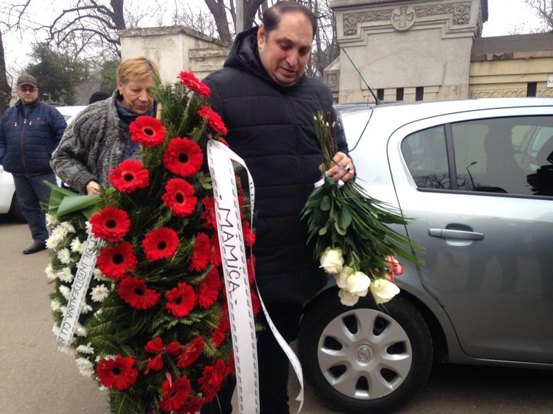 Mama Cristinei Țopescu a venit însoțită de două persoane, o femeie care a și ajutat-o să coboare din mașină, și de un bărbat, care a dus în capelă o coroană din flori roșii, pe care era trecut mare doar un nume: MĂMICA!