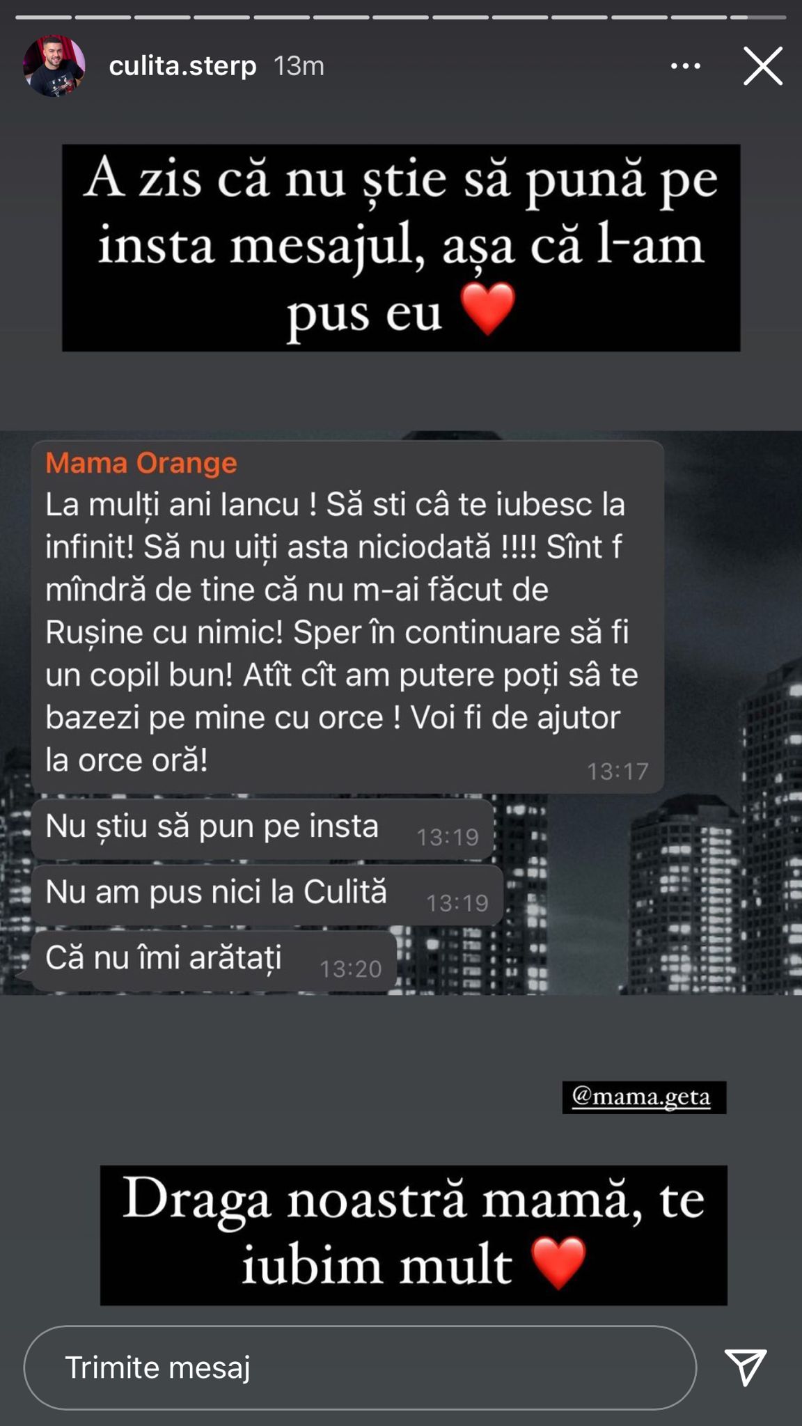 Așa că, băiatul cel mare, Culiță Sterp, a postat el mesajul pe care mama lui l-a scris cu ocazia zilei de naștere a lui Iancu. Mama Geta a mărturisit că Iancu nu a făcut-o niciodată de rușine și că este mândră de el!