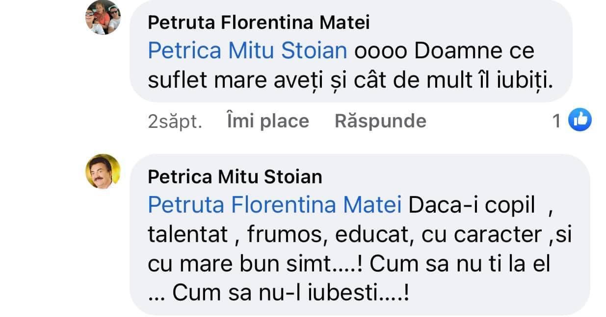 Ma opresc aici fiindcă nu vreau sa va plictisesc ca de spus ar fii multe, fiindcă știu multe dar eu nu vreau sa întinez memoria Maestrului asa cum a făcut-o “bunul lui prieten” spunând ca citez: “mi-au plăcut mult prea mult femeile ca sa trec la bărbați,” lăsând loc de interpretări. Dle dacă erați prieten cu adevărat nu făceați asemenea declarații indiferent de ce vorbe va ieșise, punându-l pe Maestru intr-o situație urâta. Maestrul Petrică Mîțu Stoian va rămâne unic, nimeni nu ii va lua locul și nici nu se va ridica la valoare lui, era unic in tot ceea ce făcea. Va rog sa nu mai dați cu “pietre “in copil, nu mai judecați copilul, este prea educat și cu mult bun simt pentru vremurile pe care le trăim. Uitați de ce îl iubea Maestru pe acest copil: