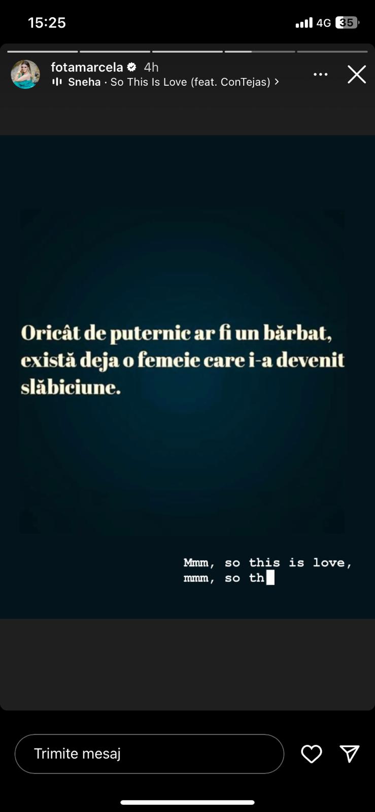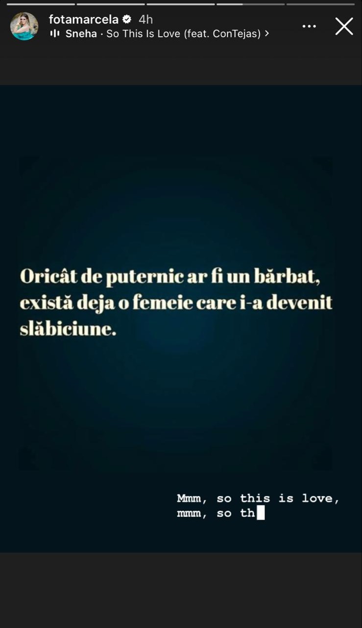 „Oricât de puternic ar fi un bărbat, există deja o femeie care i-a devenit slăbiciune. Asta este iubirea”, a fost mesajul pe care Marcela Fota l-a postat în mediul online.