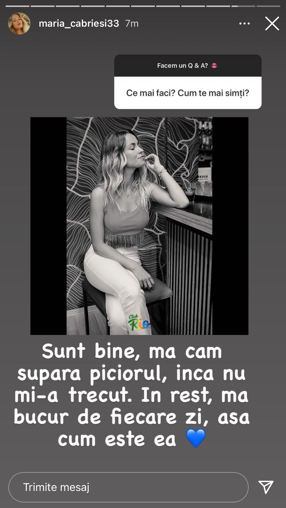 ”Sunt bine, ma cam supara piciorul, inca nu mi-a trecut. In rest, ma bucur de fiecare zi, asa cum este ea”, a mărturisit Maria, pe contul ei de Instagram.