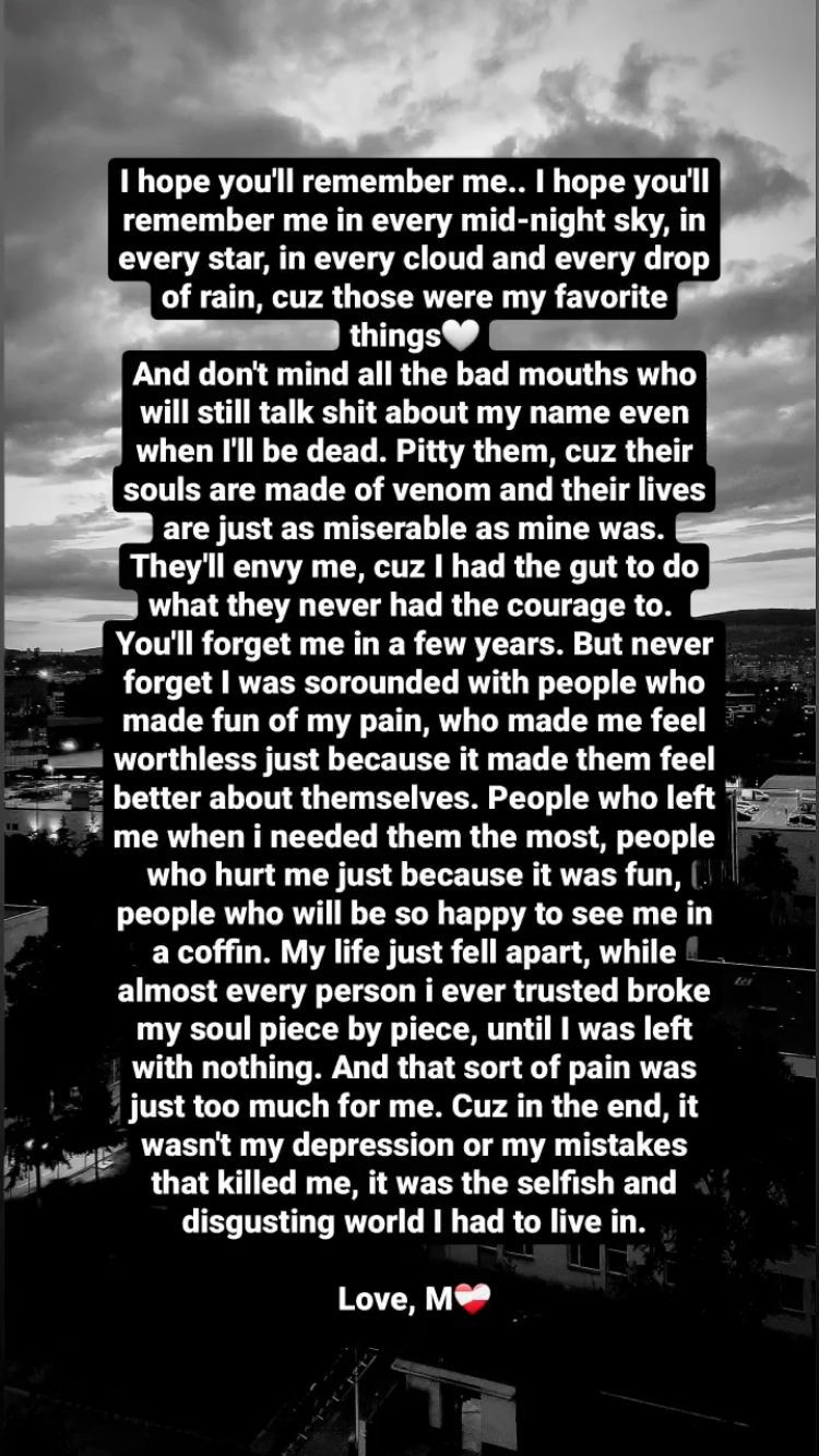 Maria a premeditat momentul în care a ales să îi spună adio vieții. Fata a postat un mesaj pe contul său de Instagram, menit să ajungă la toate persoanele care o batjocoreau. După aceea, tânăra s-a urcat pe un bloc din Cluj-Napoca, mai exact la etajul 12, de unde a sărit fără să stea prea mult pe gânduri.