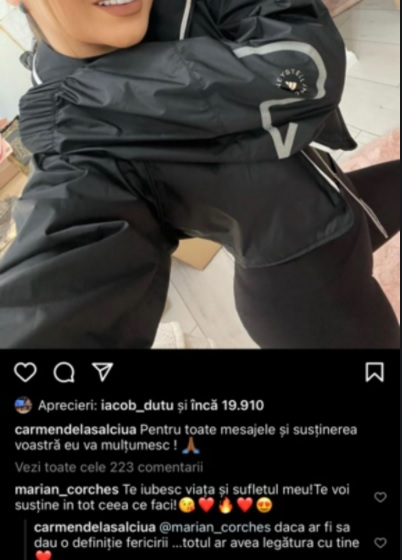 Carmen de la Sălciua și noul ei iubit, Marian Corcheș, se iubesc de mama focului! Celebra cântăreață și afaceristul trăiesc cea mai frumoasă poveste de iubire, sinceră, așa cum rar întâlnești. Artista și iubitul ei nu se mai feresc și nu mai țin cont de gura lumii, care îi critica la începutul relației lor amoroase. Ei bine, cei doi îndrăgostiți au învățat să nu mai bage în seamă gurile rele și să-și vadă de iubirea lor.