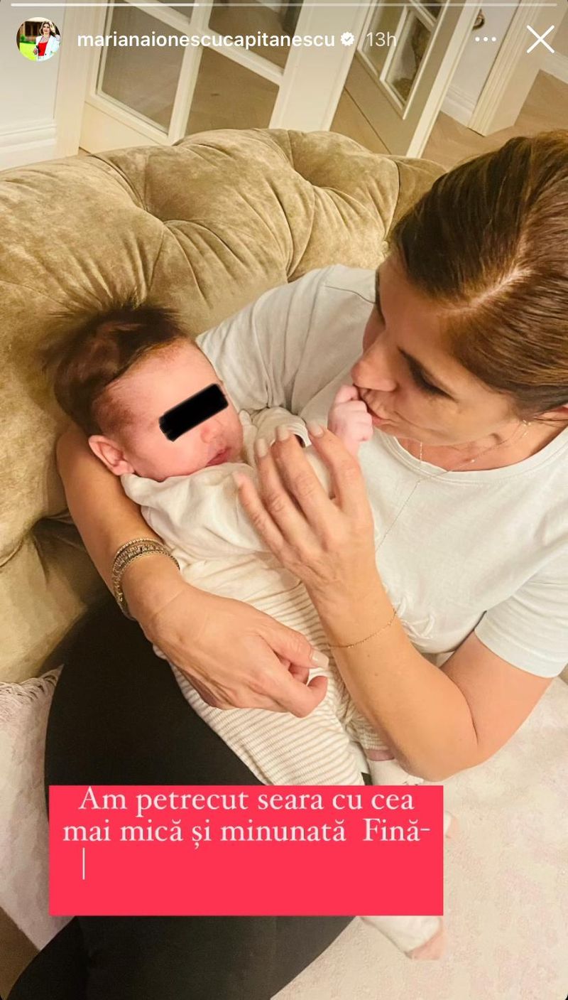 În imagine, Mariana Ionescu Căpitănescu îi sărută părintește mânuța micuței sale finuțe, mărturisind că a avut parte de o seară perfectă în compania bebelușului.