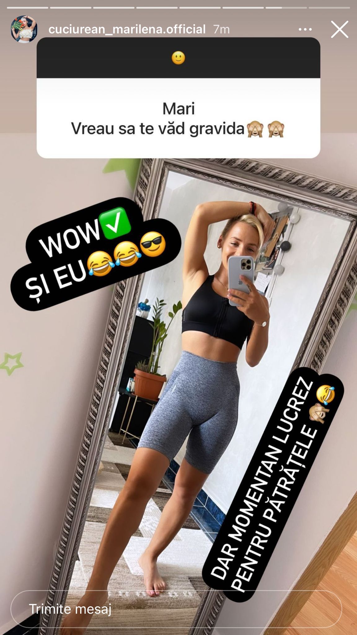Cum am spus mai sus, Marilena este foarte activă pe internet, așa că încearcă să răspundă cât mai mult la întrebările curioșilor. De data aceasta, un internaut i-a spus Marilenei că își dorește s-o vadă gravidă. Ei bine, războinica de la Survivor nu a ezitat să-i răspundă!