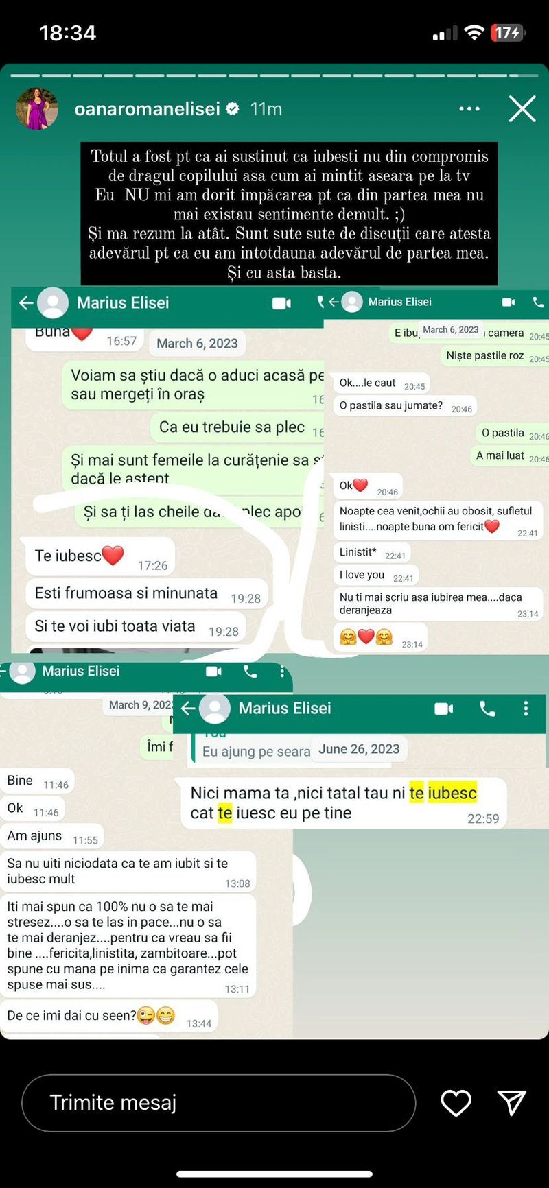 Femeia a postat câteva conversații din trecut, pe care le-a avut cu Marius Elisei, acolo unde acesta îi spunea că o iubește foarte tare și că își dorește să se împace cu ea. De asemenea, acest lucru nu a fost deloc pe placul lui Marius, așa că a făcut câteva declarații despre acest subiect, precizând că, într-adevăr, a insistat la acel moment și i-a spus mamei copilului lui ce a simțit.