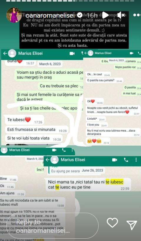 În prima apariție publică pe care Marius Elisei a avut-o după ce a dat de înțeles în mediul online că iubește din nou, a mărturisit că, de o bună bucată de vreme, a rămas în relația cu Oana Roman doar de dragul fiicei lor, și nicidecum că ar mai fi existat sentimente la mijloc din partea lui. De partea cealaltă, fosta sa soție și-a dorit să scoată la suprafață adevărul, așa că Oana Roman a postat în mediul online o serie de mesaje private pe care Marius Elisei i le-a trimis în ultimele luni și în care îi spunea că o iubește chiar și mai multe decât o iubesc părinții săi.