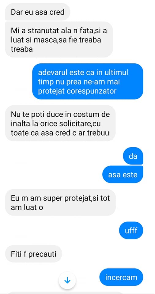 ”Nu te poți duce în costum de înaltă protecție la orice solicitare, deși eu cred că ar trebui. Eu m-am superprotejat și tot am luat-o (…) Aici suntem pe ATI numai cadre medicale, doctorii și asistenții. Toți urlăm că murim, că ne sufocăm, toți plângem la fel”, spune asistenta medicală internată pe ATI. MArcela Tănase, cea care a publicat conversația, o întreabă pe colega sa ce medicamente îi sunt administrate. ”Antiviral, antiwiremic, antibiotic, Fraxiparină… Nu pot să scriu că am cateterism arterial, consolă, robineți cu 6 linii venoase.. Fluimucil, vitamina C, Multe… Sunt pe 10 injecții (nr. intravenoase)”, îi răspunde asistenta infectată.