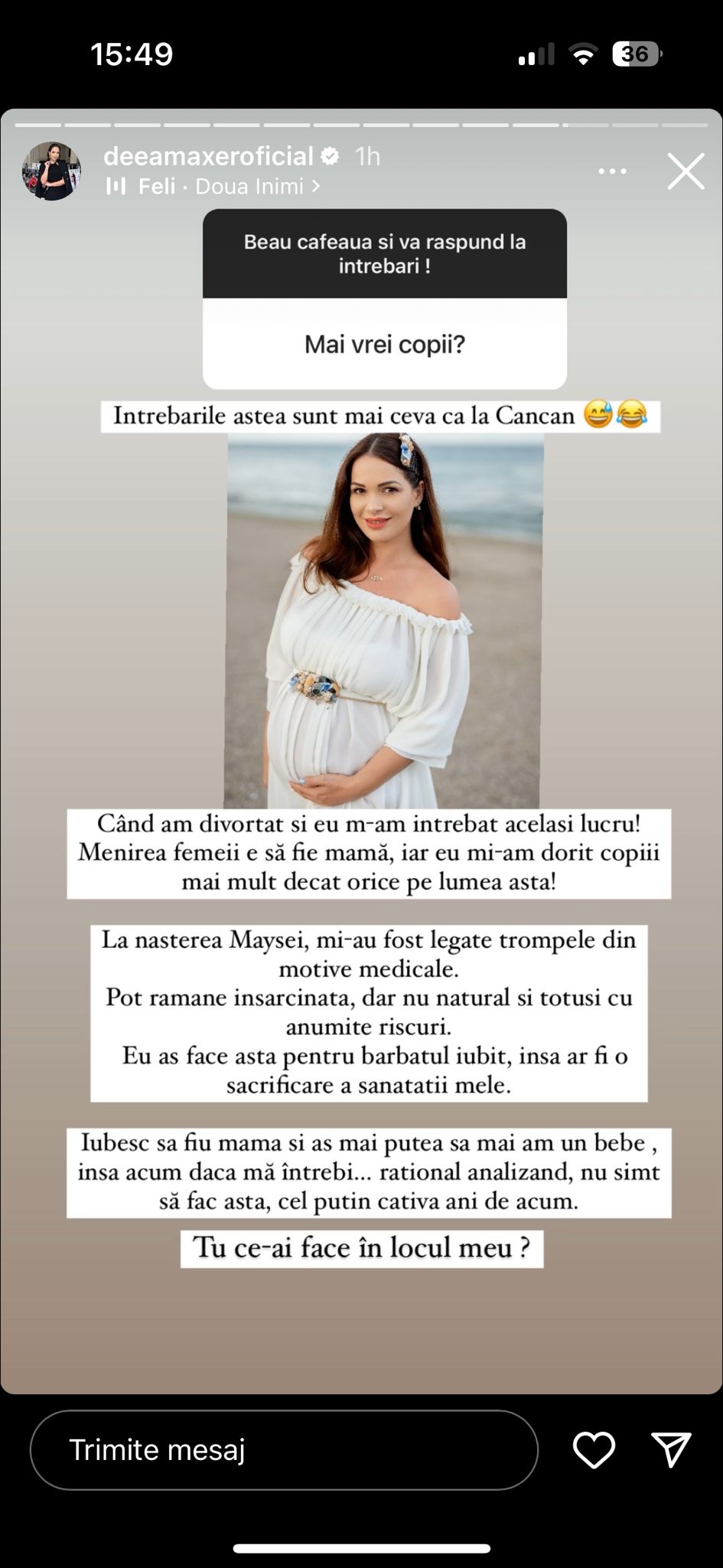 „Când am divorțat și eu m-am întrebat același lucru! Menirea femeii e să fie mamă, iar eu mi-am dorit copiii mai mult decât orice pe lumea asta! La nașterea Maysei, mi-au fost legate trompele din motive medicale. Pot rămâne însărcinată, dar nu natural și totuși cu anumite riscuri. Eu aș face asta pentru bărbatul iubit, însă ar fi o sacrificare a sănătății mele. Iubesc să fiu mamă și aș mai putea să mai am un bebe, însă acum dacă mă întrebi…rațional analizând, nu simt să fac asta, cel puțin câțiva ani de acum”, a fost mesajul postat de Deea Maxer pe Instagram.