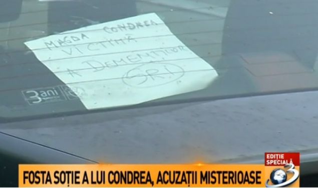 Potrivit Antena 3, Laura Marilena Condrea, prima soţie a lui Dan Condrea, a transmis un mesaj misterios prin intermediul unor coli de hârtie lipite pe partea interioară a geamului unei maşini parcate în curtea acesteia.