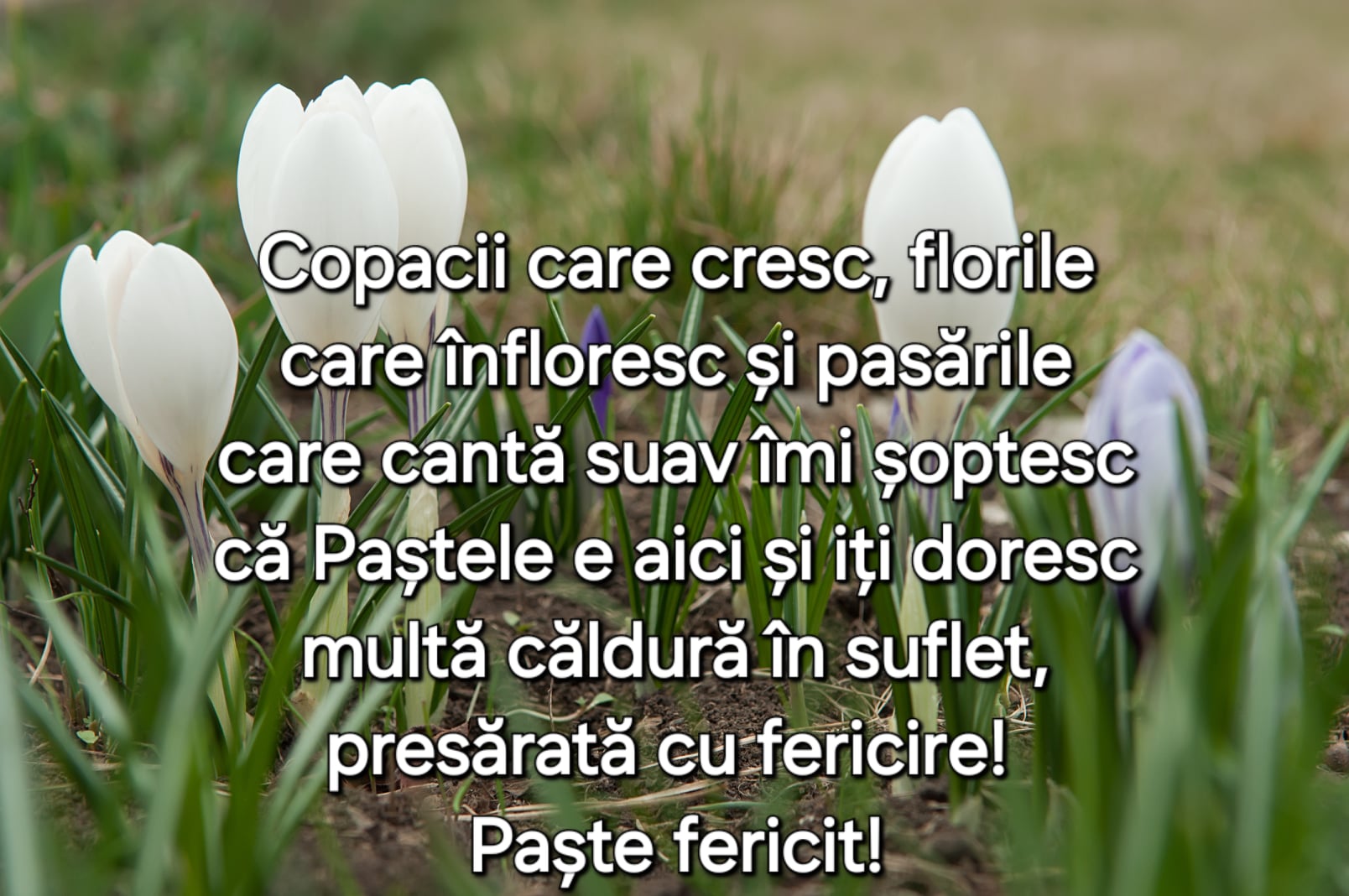 -Copacii care cresc, florile care înfloresc si păsările care canta suav, îmi șoptesc ca Paștele e aici și îți doresc multă căldură în suflet, presărată cu fericire! Paște fericit!