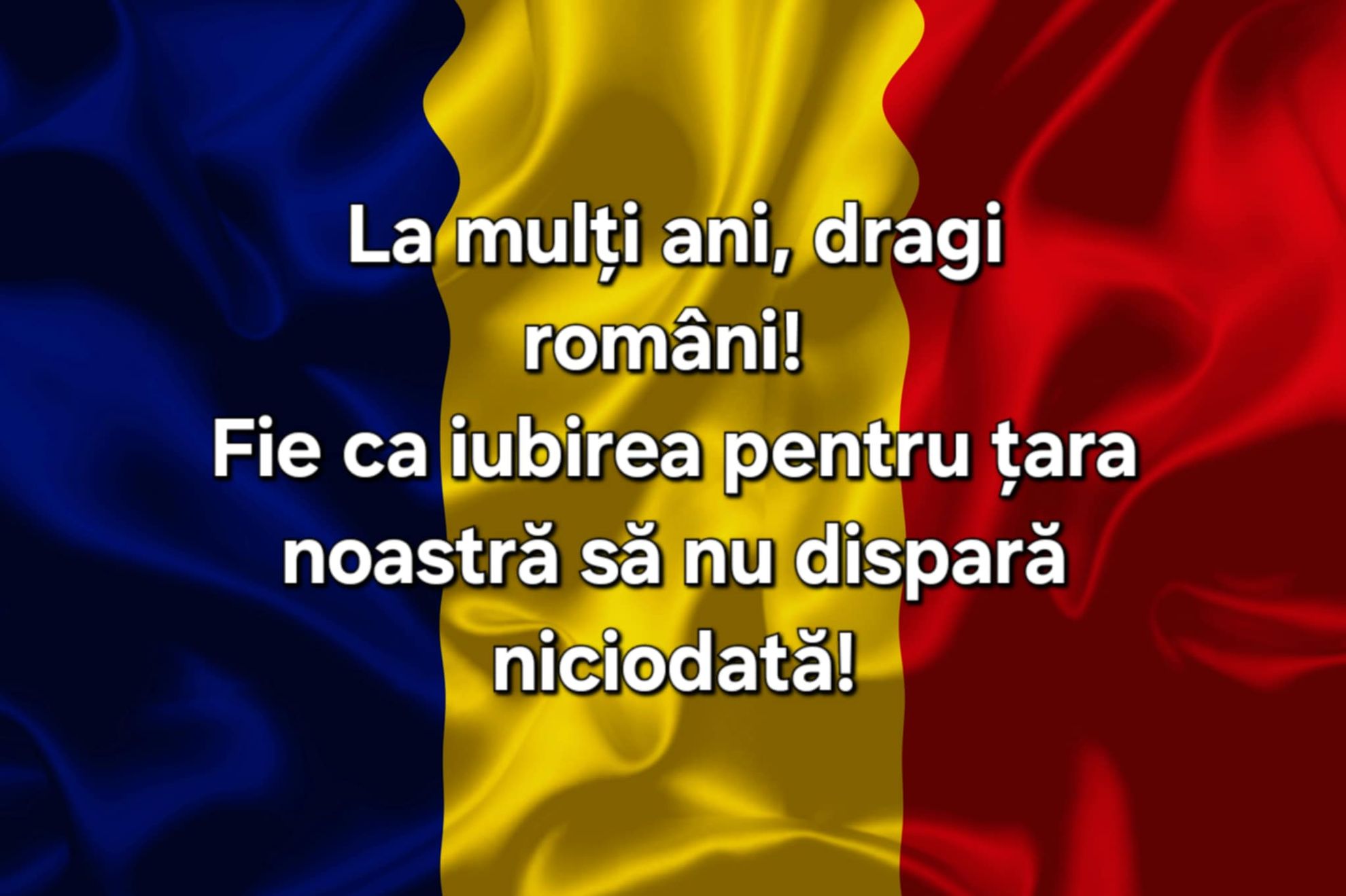 La mulți ani România! La mulți ani prieteni! La mulți ani români de pretutindeni! Avem o mie de motive să fim mândri că suntem români! La mulți ani, România!!! La mulți ani României, tuturor românilor și celor ce simt și gândesc românește! Să fii mândru că ești român, trăind și simțind românește, zi de zi. La Mulți Ani României! La mulți ani tuturor românilor și celor ce iubesc România! La Mulți Ani românilor de pretutindeni! E ziua noastră, a tuturor și trebuie să ne bucurăm de ea! Fie ca 1 Decembrie să vă aducă sănătate, fericire și multă, multă bucurie alături de cei dragi și apropiați.