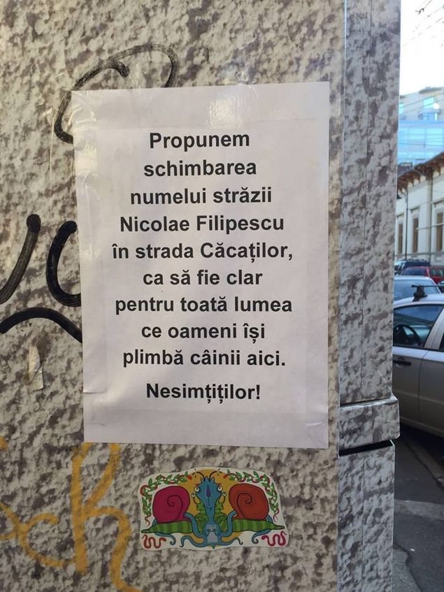 Strada este intr-adevar plina de murdarie, iar mesajul pare unul justificat. "Propunem schimbarea numelui strazii Nicolae Filipescu in strada Cacatilor, ca sa fie clar pentru toata lumea ce oameni isi plimba cainii aici. Nesimtitilor", este mesajul sec postat de cetateanul nemultumit.