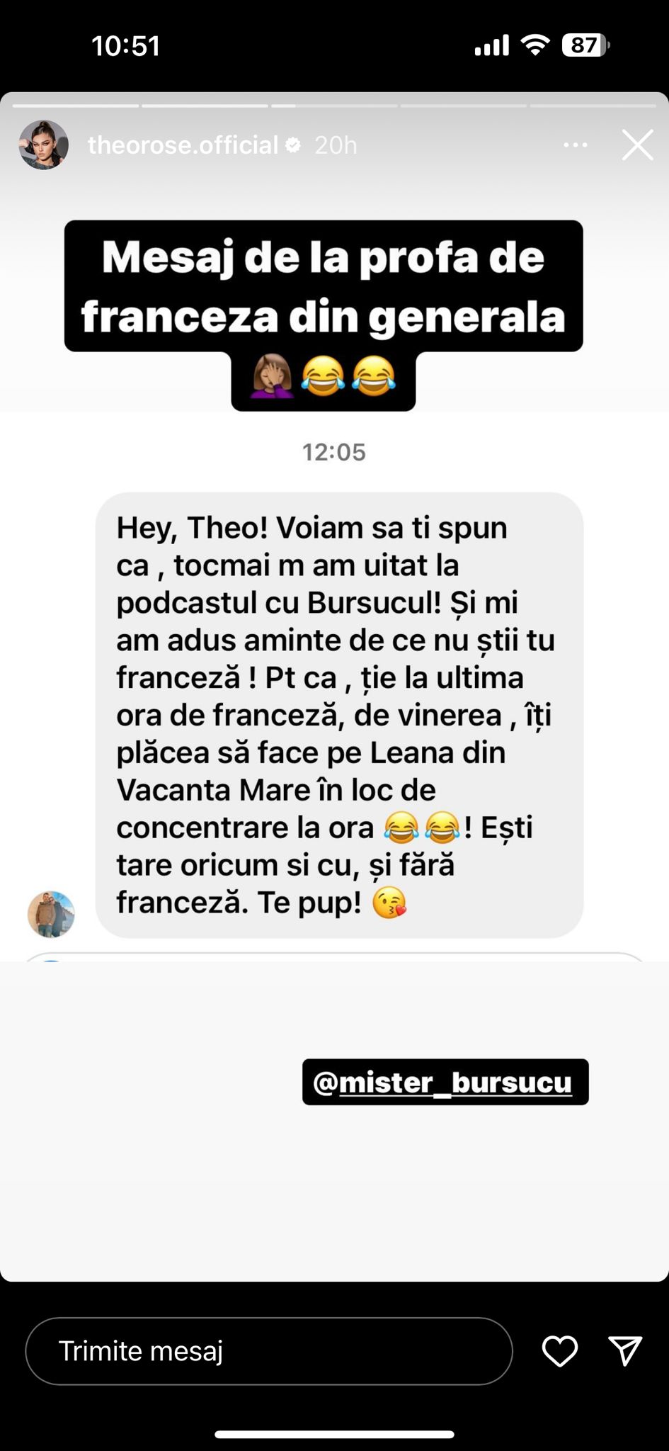 „Hey, Theo! Voiam să îți spun că tocmai m-am uitat la podcast-ul cu Bursucul! Și mi-am adus aminte de ce nu știi tu franceză! Pentru că, ție la ultima ora de franceză, de vinerea, îți plăcea să faci pe Leana din Vacanța Mare în loc de concentrare la oră! Ești tare oricum și cu, și fără franceză. Te pup!”, a fost mesajul pe care profesoara de franceză i l-a trimis lui Theo Rose.
