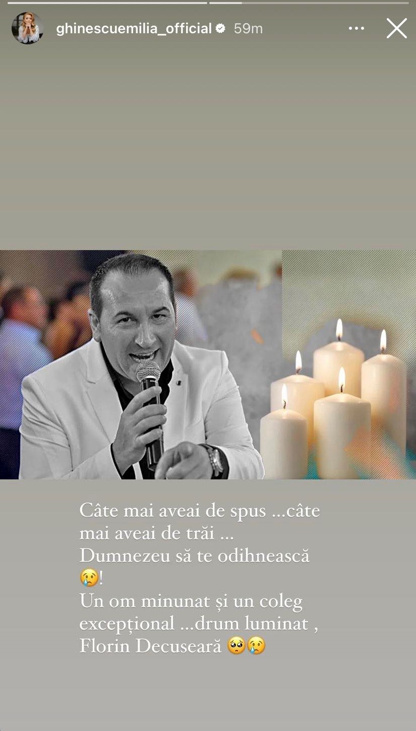 „Câte mai aveai de spus... câte mai aveai de trăit... Dumnezeu să te odihnească! Un om minunat și un coleg excepțional... drum luminat, Florin Decuseară!”, a scris Emilia Ghinescu, pe rețelele de socializare.