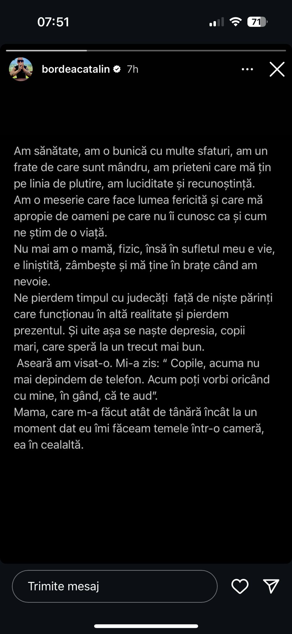 Ne pierdem timpul cu judecăți față de niște părinți care funcționau în altă realitate și pierdem prezentul. Și uite așa se naște depresia, copii mari, care speră la un trecut mai bun. Aseară am visat-o. Mi-a zis: „Copile, acuma nu mai depindem de telefon. Acum poți vorbi oricând cu mine, în gând, că te aud”. Mama, care m-a făcut atât de tânără încât la un moment dat eu îmi făceam temele într-o cameră, ea în cealaltă”, a scris Cătălin Bordea pe Instagram.