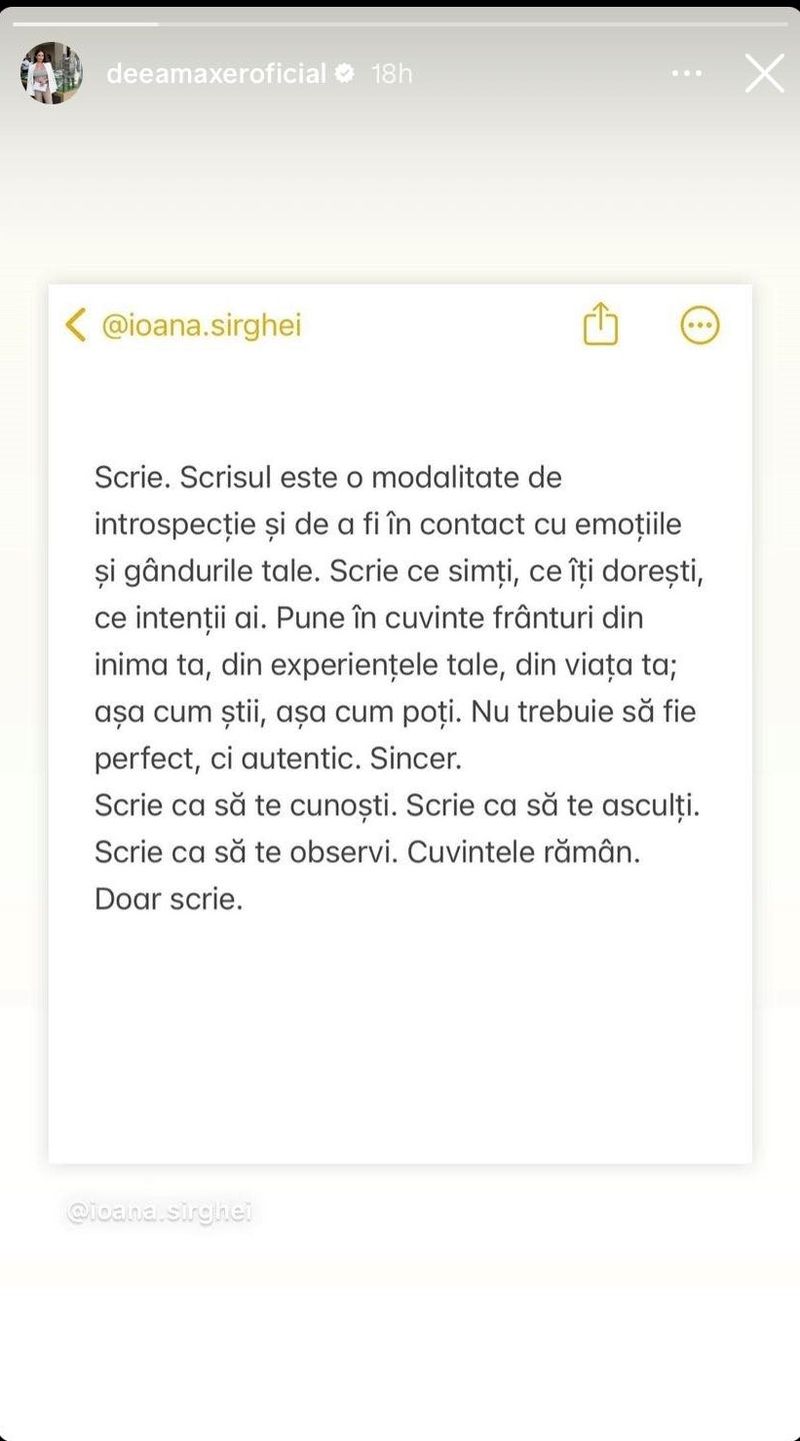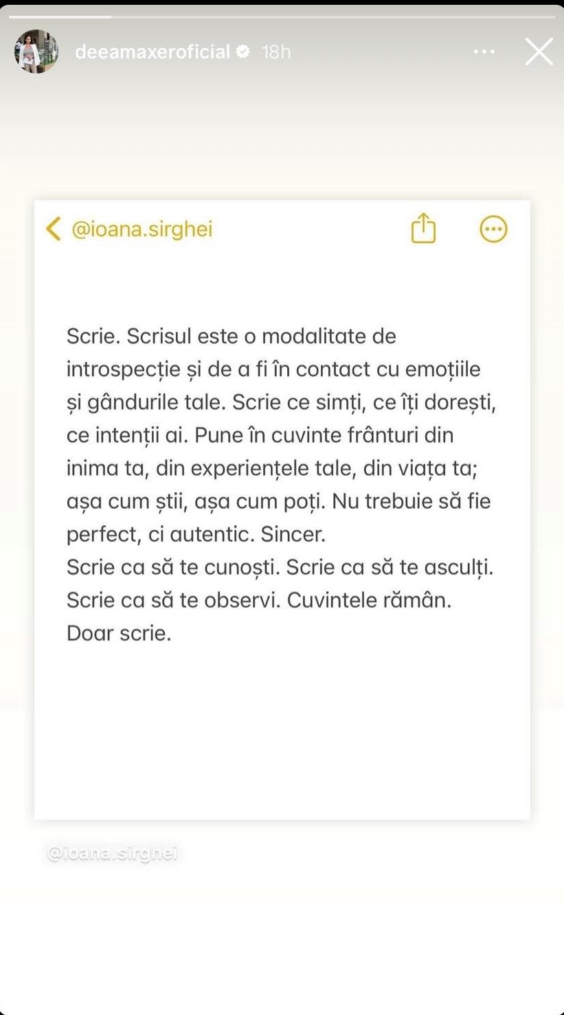„Scrie. Scrisul este o modalitate de introspecție și de a fi în contact cu emoțiile și gândurile tale. Scrie ce simți, ce îți dorești, ce intenții ai. Pune în cuvinte frânturi din inima ta, din experiențele tale, din viata ta; așa cum știi, așa cum poți. Nu trebuie să fie perfect, ci autentic. Sincer. Scrie ca să te cunoști. Scrie ca să te asculți. Scrie ca să te observi. Cuvintele rămân. Doar scrie”, este mesajul pe care Deea Maxer l-a postat pe Instagram.