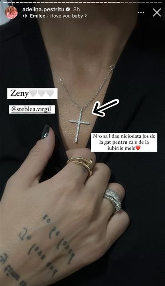 „Și cadoul care nu poate concura cu niciunul din lumea asta. Te iubesc infinit! N-o să-l dau niciodată jos de la gât, pentru că e de la iubirile mele.”, a scris Adelina Pestrițu în mediul online.