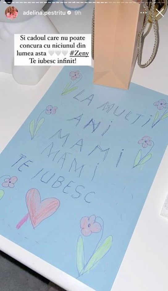 Chiar înainte de miezul nopții, Adelina Pestrițu a împărtășit cu fanii ei cum a fost surprinsă de fiica și soțul său. Influencerița a primit din partea familiei ei un lănțișor cu diamante, în formă de cruce, însă Zeny i-a mai oferit mamei sale și o scrisoare emoționantă.