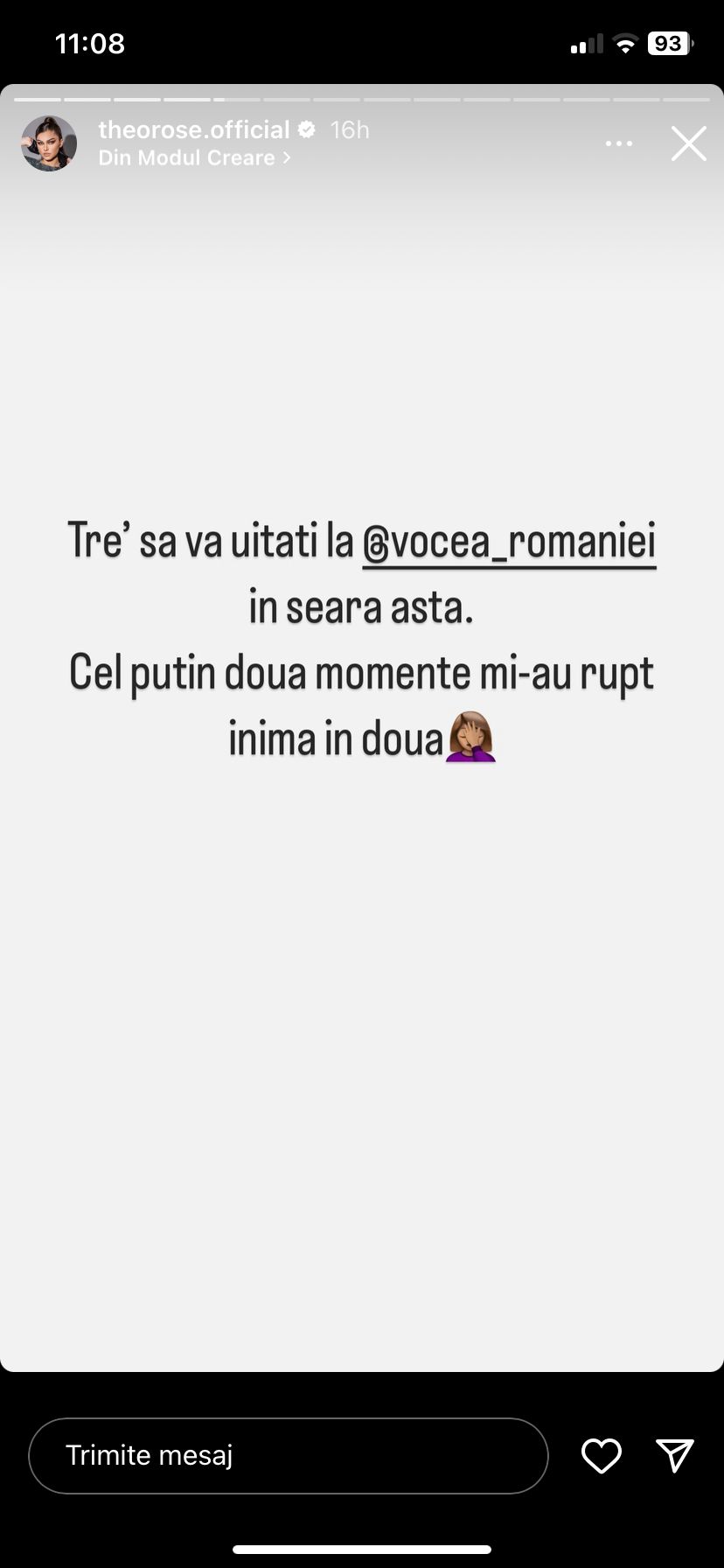 „Tre să vă uitați la (n.r. numele emisiunii) în seara asta. Cel puțin două momente mi-au rupt inima în două”, a fost mesajul transmis de Theo Rose pe pagina ei de Instagram.
