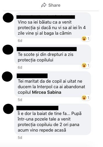 ”Te-ai măritat, dar de copil ai uitat. Ne ducem la Interpol să spunem că ai abandonat copilul”, i-a mai scris altcineva.
