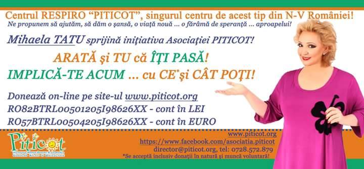 Daca iti pasa, fa ceva!!! Oricat de putin. Conteaza!”, a scris Mihaela Tatu prietenilor virtuali, postand si afisul campaniei declansata de Centrul „Piticot”, care strange fonduri pentru ajutorarea copiilor fara posibilitati. De altfel, fosta prezentatoare, acum stabilita la Oradea, este si imaginea campaniei.