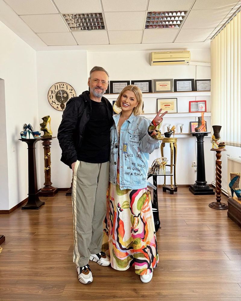 „Pantofii sunt o capodoperă, semnată de Mihai Albu, am combinat două din celebrele modele Icon Heels, cu toc de 18 cm și a ieșit un model unic, creat special pentru mine! De vreo 10 ani, port creațiile lui, în diverse contexte și sunt extrem de mandră că în ziua nunții mele, energia lui Mihai o să mă facă să mă simt la înălțime și la propriu și la figurat! Avem o prietenie frumoasă, curată, sinceră, bazată pe foarte mult respect și apreciere! Este un învingător și a arătat asta de fiecare dată, nu doar acum! Este plin de viață, muncește cu poftă și dragoste, în atelierul lui de creație și pregătește o colecție