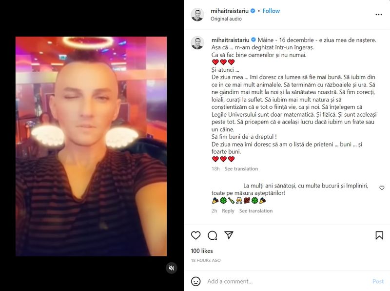 „Mâine – 16 decembrie – e ziua mea de naștere. Așa că … m-am deghizat într-un îngeraș. Ca să fac bine oamenilor și nu numai. Și-atunci …De ziua mea…îmi doresc ca lumea să fie mai bună. Să iubim din ce în ce mai mult animalele. Să terminăm cu războaiele și ura. Să ne gândim mai mult la noi și la sănătatea noastră”, a transmis Mihai Trăistariu, pe pagina sa de Instagram.