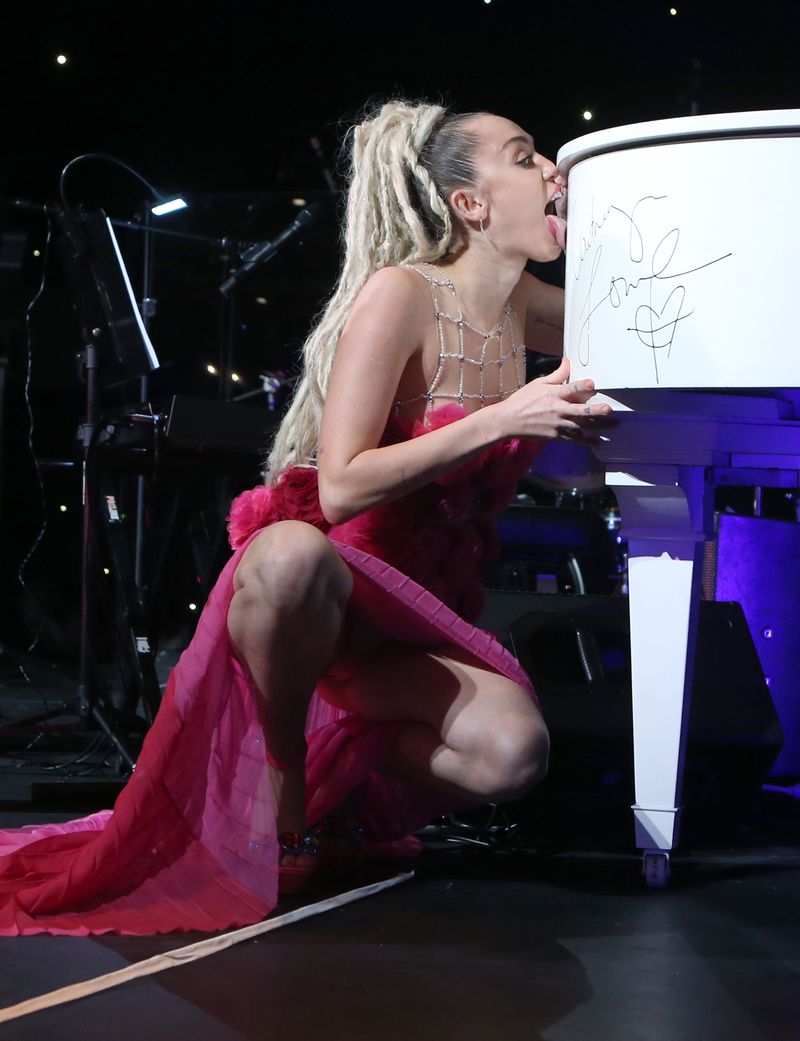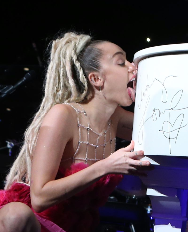 Imbracata intr-o rochie roz, vaporoasa, Miley Cyrus a urcat pe scena. Parea a fi un concert normal si decent pana in momentul in care cantareata s-a aplecat si a inceput sa linga piciorul pianului. In momentul actiunii, Miley nu a mai avut nicio grija de tinuta sa. S-a cracanat si si-a aratat lenjeria intima, in toata splendoarea.