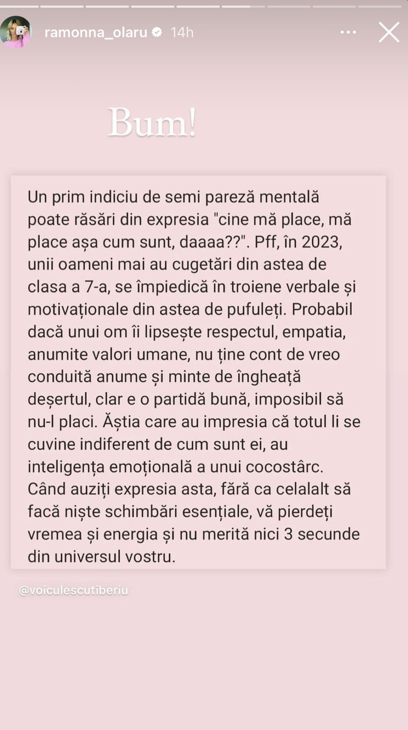 „Un prim indiciu de semi pareză mentală poate răsări din expresia «cine mă place, mă place așa cum sunt, da?». Pff, în 2023 unii oameni mai au cugetări din astea de clasa a 7-a, se împiedică de troiene verbale și motivaționale și astea de pufuleți. Probabil dacă unui om îi lipsește respectul, empatia, anumite valori umane, nu ține cont de vreo conduită anume și minte de îngheață deșertul, clar e o partidă bună, imposibil să nu-l placi. Ăștia care au impresia că totul li se cuvine indiferent de cum sunt ei, au inteligența emoționată a unui cocostârc. Când auziți expresia asta, fără ca celălalt să facă niște schimbări esențiale, vă pierdeți vremea și energia și nu merită nici 3 secunde din universul vostru.”, a fost mesajul pe care Ramona Olaru l-a postat în mediul online.