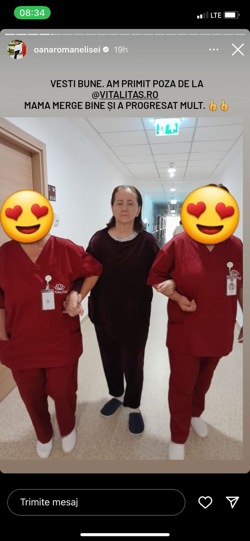 „Vești bune. Mama merge bine și a progresat mult”, a scris Oana Roman pe Instagram.