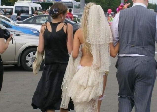 Cu jartiera la vedere, mireasa tupeista a avut probleme la intrarea in biserica. La cat de vulgara e, nici nu e de mirare.