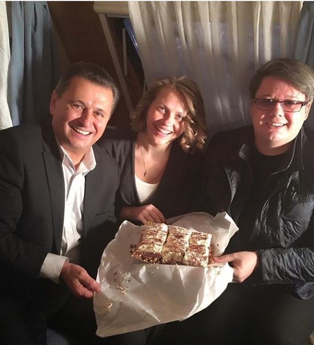 ”La filmări…cu prăjituri de la ‘Nea Marin”, a scris ea în dreptul fotografiei în care apare alături de Nea Marin şi Fuego.