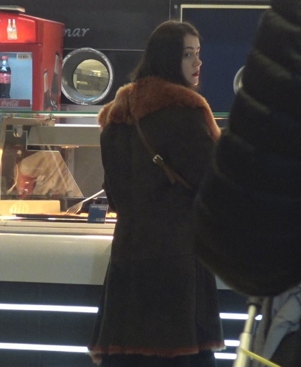 Iubitul ei a venit langa ea, i-a soptit ceva la ureche si a sarutat-o tandru pe obraz. In tot acest timp, actrita aproape ca nu schita niciun gest. Ea a achitat nota, a luat mancarea si s-a indreptat spre o masa, unde a cinat alaturi de iubitul ei.