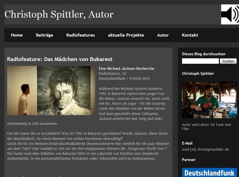 Christoph Spittler a realizat un reportaj de radio de 53 de minute care a fost difuzat pentru prima dată pe 28 august 2018, de ziua lui Michael Jackson. Reportajul se numește ”Fata din București! O cercetare a lui Michael Jackson” și se poate găsi pe blogul autorului.