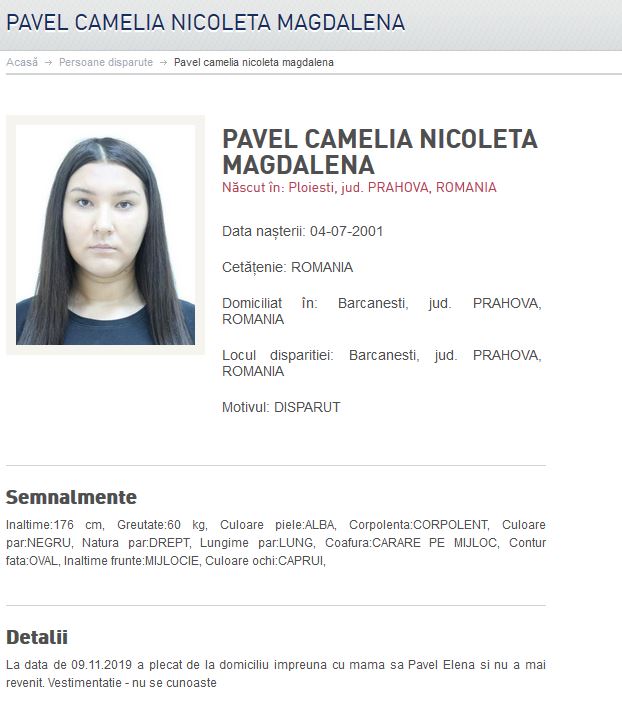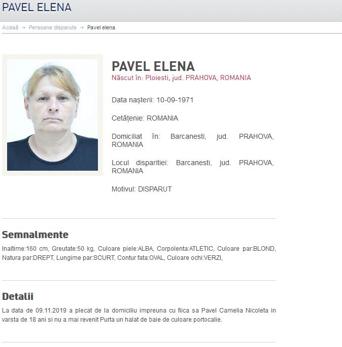 Sâmbătă, 9 noiembrie, Pavel Elena, în vârstă de 48 de ani, domiciliată în localitatea Bărcănești, județul Prahova, a plecat de la dimiciliu împreună cu fiica ei, Pavel Camelia Nicoleta, în vârstă de 18 ani. Cele două nu au mai fost văzute de atunci. Elena purta un halat de baie de culoare portocalie.