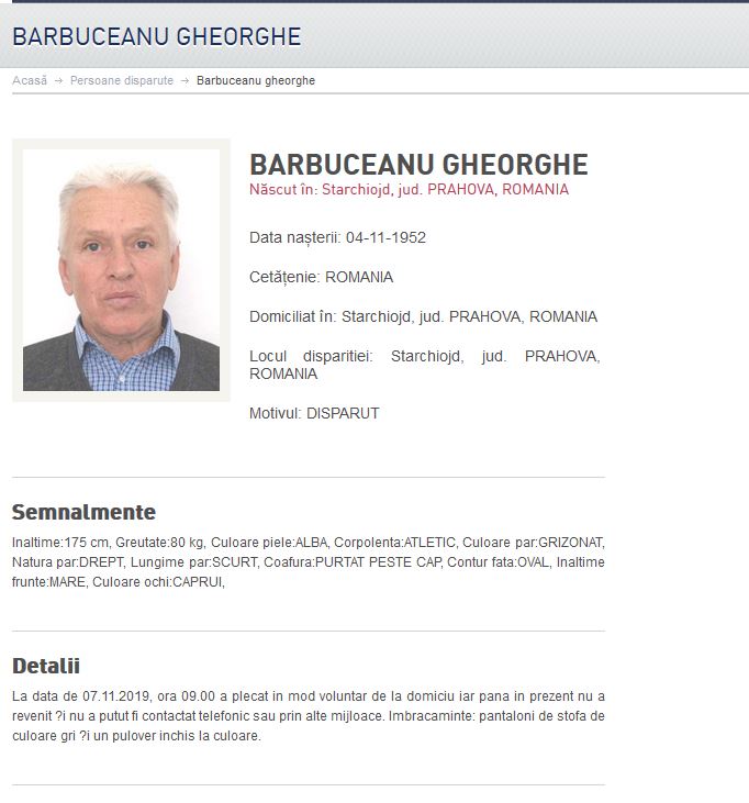 7 noiembrie 2019 – a dispărut Bărbuceanu Gheorghe, 67 ani din Starchiojd, județul Prahova. A plecat în mod voluntar de la domicliu și nu a mai revenit. De asemenea, nu a mai putut fi contactat telefonic sau prin alte mijloace.