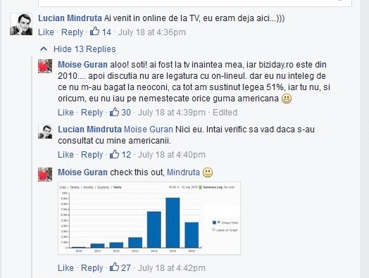A fost de ajuns, ca intre cei doi sa porneasca un schimb de replici ironice, sustinuti de amici virtuali, care-i tot atatau. Intr-un final, unul dintre cei care comentau, a aruncat replica: “Amandoi ati ajuns someri si postati doar pe facebook. Pacat”