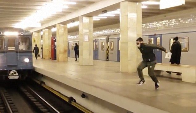 Un iubitor de adrenalina a recurs la un gest extrem, in statia de metrou, in timp ce multi oameni asteptau in statie trenul.