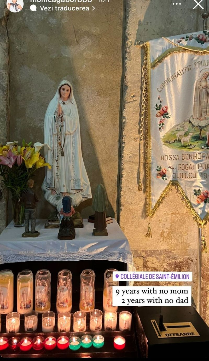 Fosta doamnă Columbeanu este foarte activă pe rețelele de socializare și mereu în contact cu fanii ei de pe Instagram, cărora le arată tot ce se întâmplă în viața ei. Aflată în vacanță alături de Mr. Pink, în Franța, Monica Gabor a postat o mulțime de imagini, printre care și una dintr-o biserică. Aceasta a mers pentru a le aprinde o lumânare părinților ei plecați din această lume și pentru a se ruga pentru sufletele lor adormite.