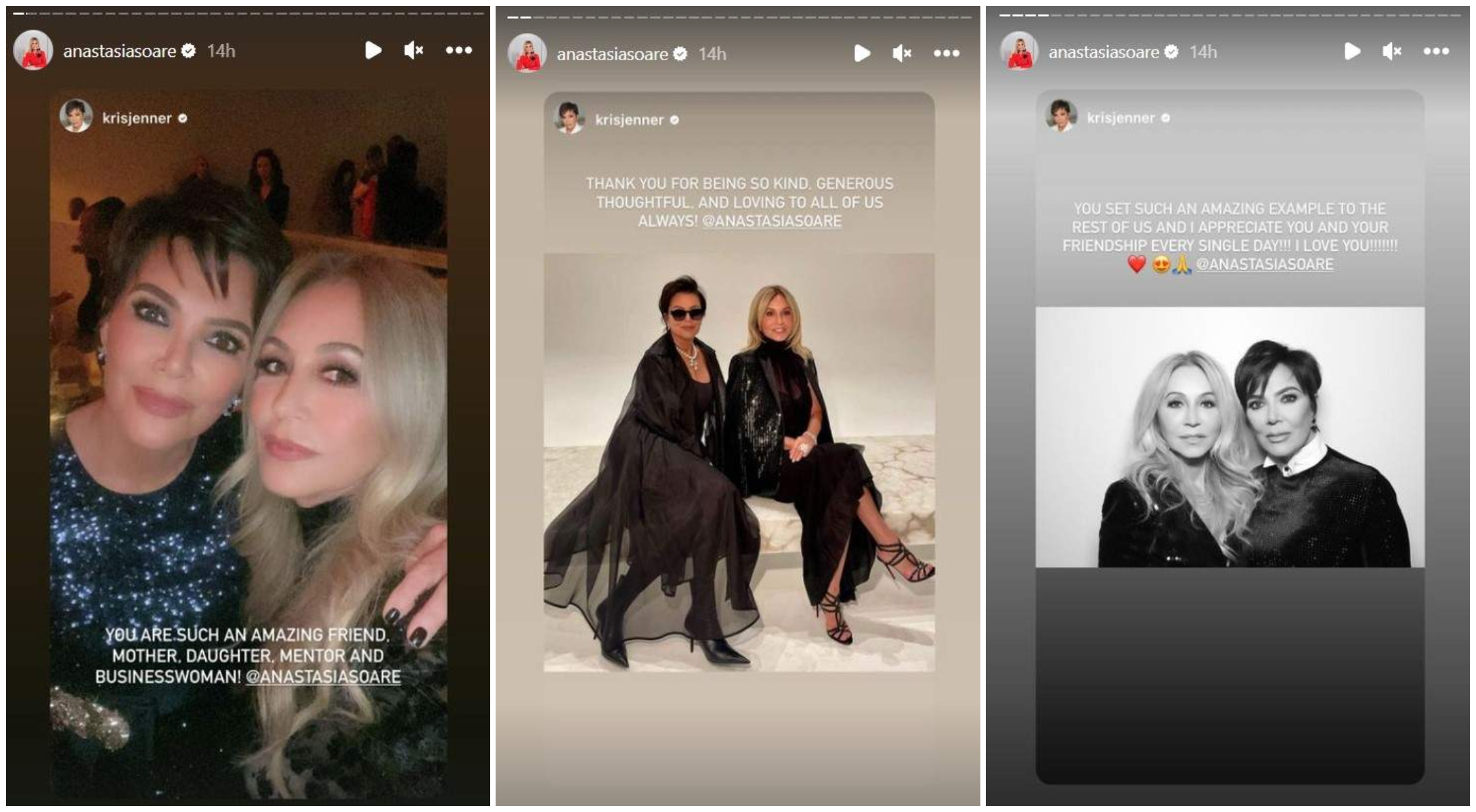 „Ești o prietenă, o mamă, o fiică, un mentor și o femeie de afaceri atât de minunată! Mulțumesc pentru că ești atât de bună, generoasă, grijulie și iubitoare cu noi toți mereu! Ești un exemplu incredibil pentru noi și te apreciez pe tine și prietenia ta pe fiecare zi!! Te iubesc!!!”, i-a transmis Kris Jenner în mediul online Anastasiei Soare.