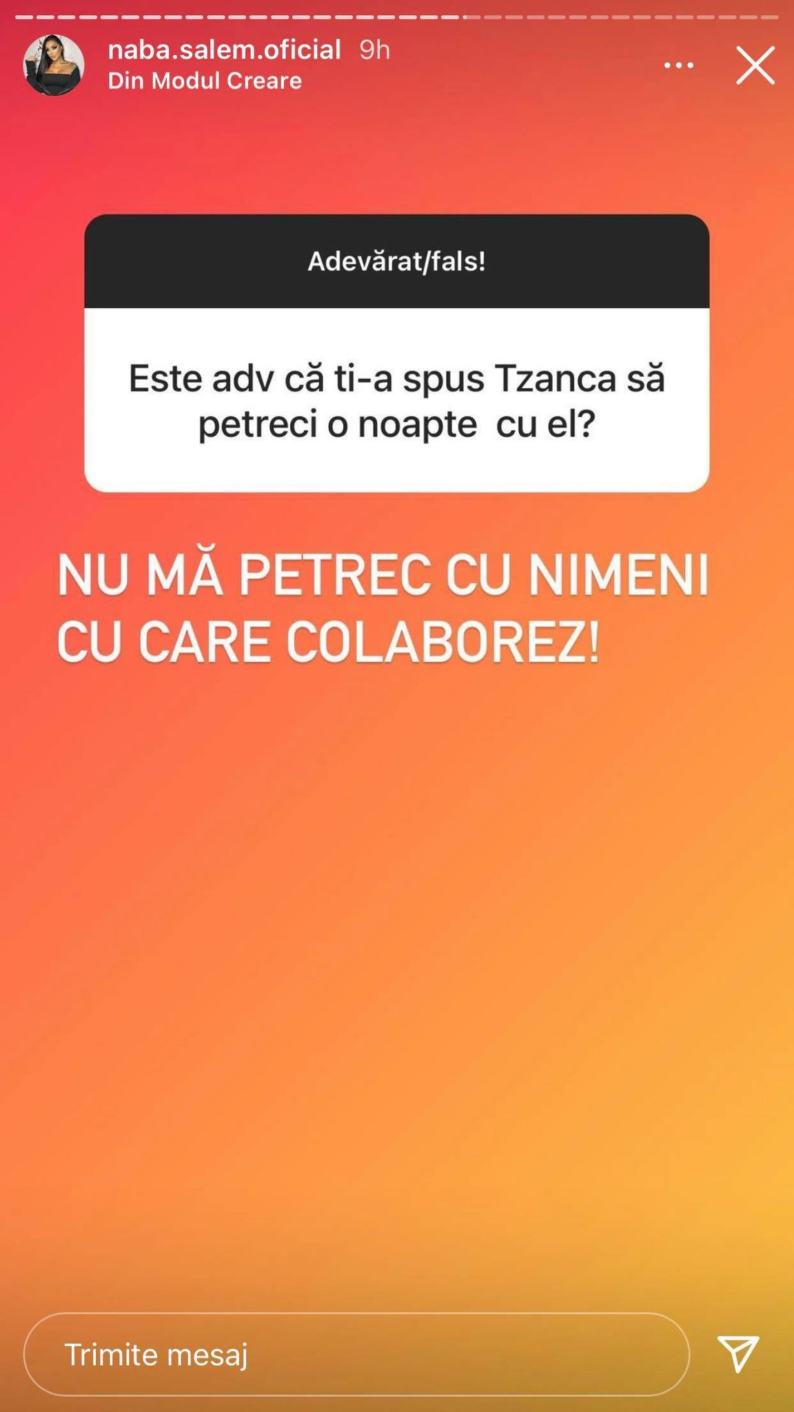 Ei bine, și de această dată, Naba Salem a fost sinceră și a răspuns scurt și la obiect la întrebarea despre Tzanca Uraganul. ”Nu mă petrec cu nimeni cu care colaborez”, a scris Naba, pe pagina ei de Instagram. Așadar, tânăra de 26 de ani nu a lăsat nicio urmă de interpretări referitor la relația ei cu Tzanca Uraganul, care este doar una profesională.
