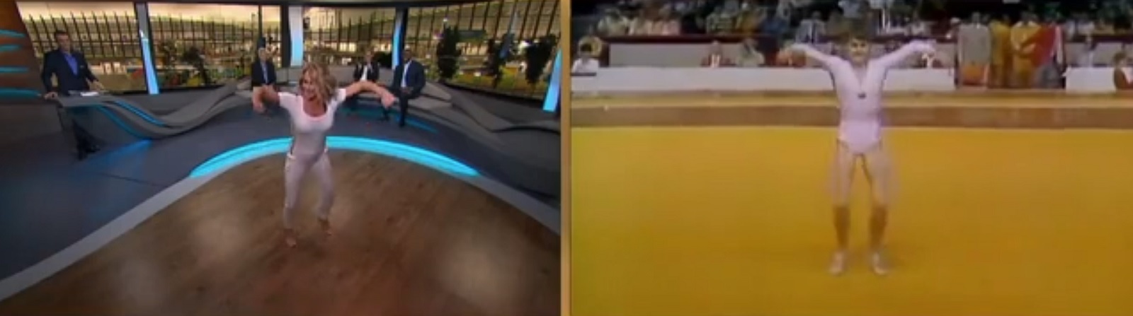 Nadia Comăneci a repetat celebrul moment din 1976 şi i-a lăsat pe toţi cu gurile căscate. Provocare a venit din partea fostului înotător Marc Spitz, punând-o să reconstituie momentul celebru din 1976, adică exerciţiu de la sol.