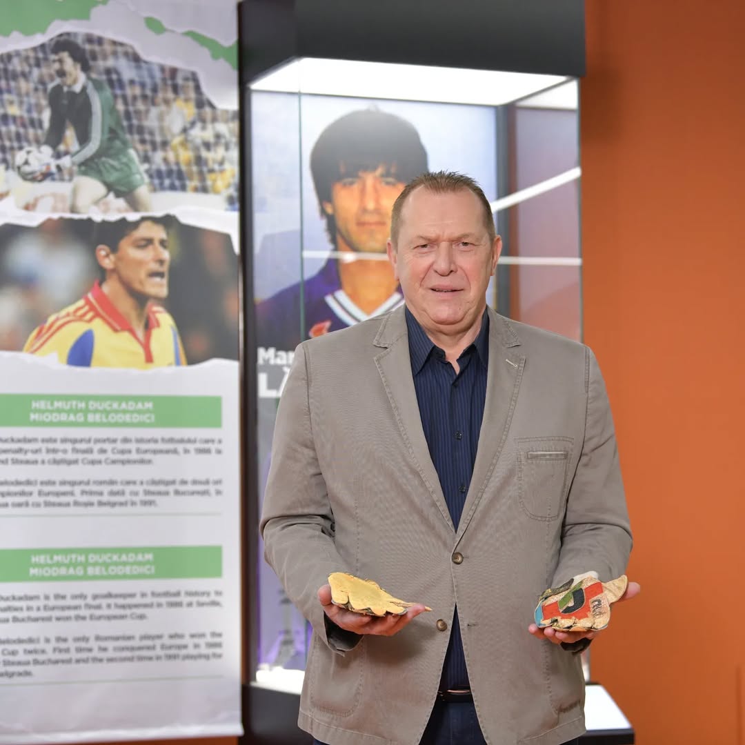 Helmut Duckadam, ținând mânușile sale de portar la Muzeul Sportului